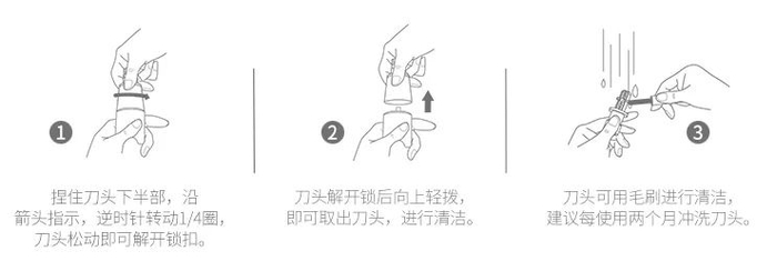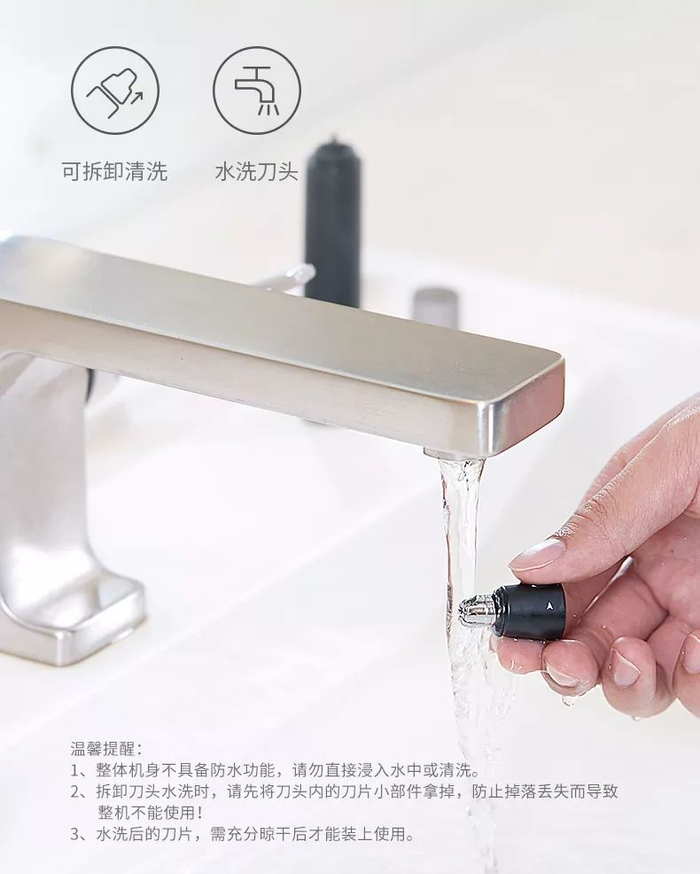 可拆卸水洗独立刀头,一冲即净,方便日常清理,干净卫生。也可使用附送的小毛刷掸去剃下的毛发。