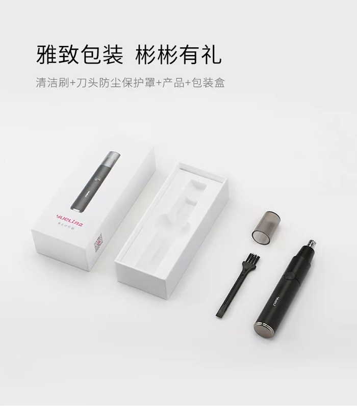 月立鼻毛修剪器雅致礼盒设计,彬彬有礼,贯彻了男人要求质感的诉求。内含清洁刷+刀头防尘保护罩+鼻毛修剪器。