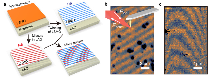 图:a. 利用两种不同应力势场的耦合在LSMO薄膜中实现摩尔调控的示意图。 b.c. SNOM测量得到的电子相摩尔纹图案,b为直线型,c为弯曲型。