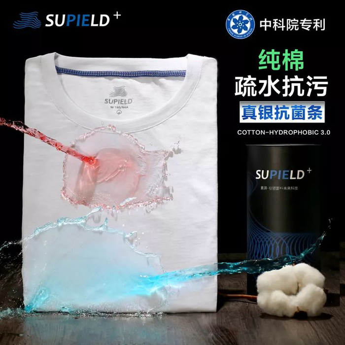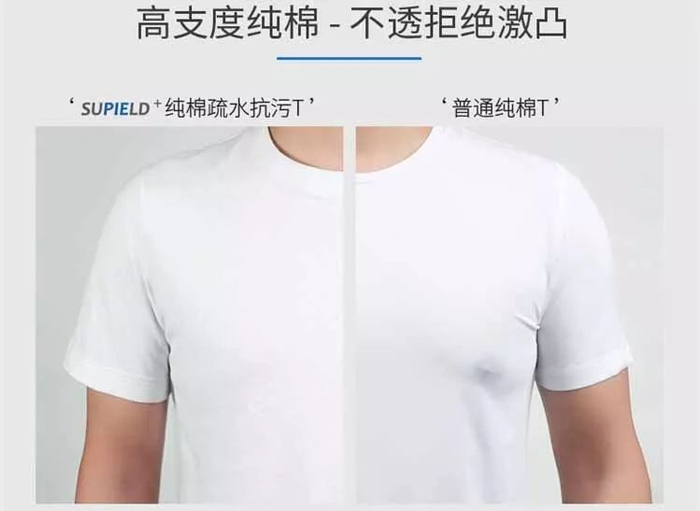 这件白T就是采用了新一代SUPIELD素湃纳米技术。能够在1毫米厚度的面料上,做到外层5级超疏水的特点。