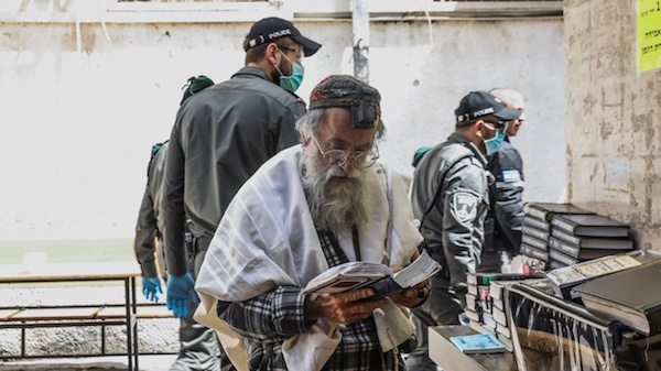 2020年3月30日,贝内巴拉克市戴口罩和手套的警察从一位正在祈祷的哈瑞迪人身边经过。进出该市目前已受到严格限制。