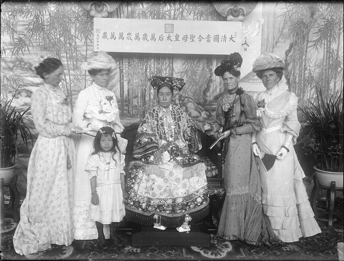 1903年康格夫人萨拉与另外三位夫人以及摄影师裕勋龄的女儿一起与慈禧太后合影。萨拉牵着慈禧太后的手。照片上方写着“大清国当今圣母皇太后万岁万岁万万岁”,落款是“光绪癸卯年”即1903年,中间御宝印款是汉文篆书“慈禧皇太后之宝”。摄影师裕勋龄是当时担任慈禧英法文翻译的裕德龄(即所谓“德龄公主”)的二哥。四名西方女士中,三人双手戴着同样的镯子,胸前挂着同样的小葫芦,应该都是慈禧赏赐的礼物。