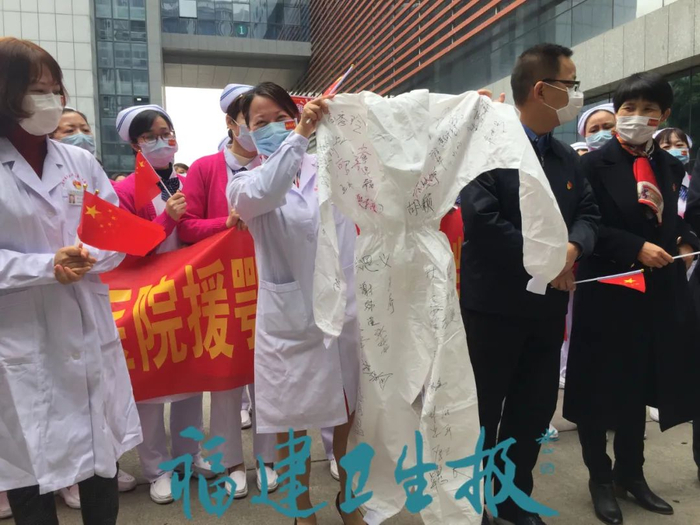 院感科主任张新安代表队员们给赵红佳书记献上了签满了福建首批支援湖北医疗队队员名字的抗疫“战袍”。
