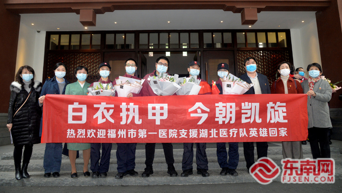 4月7日上午,福州市第一医院书记曹文瑜、院长王琳及院办、人力资源部和部分队员家属一同前往隔离点迎接罗建雄、胡颖、郭锦、林峰、朱瑞五名英雄回家,医院同事和部分队员家属在市一医院本部迎接英雄凯旋!