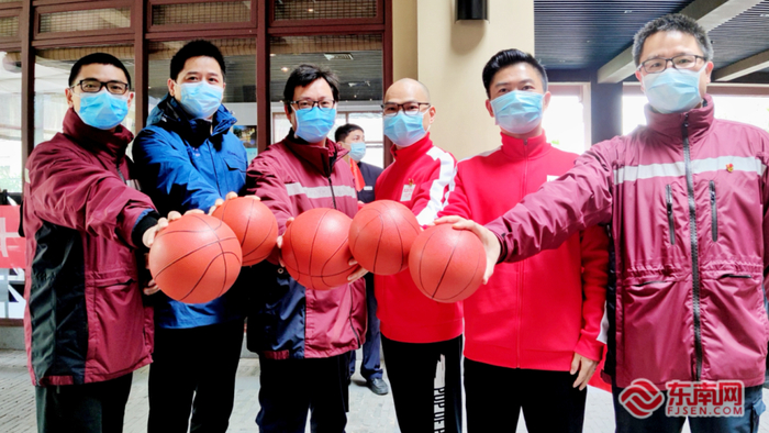 在福建首批援鄂医疗队隔离休整驻地,有一个小的投篮区,队员们经常在那里投篮比赛。4月7日上午,各队返乡前,队员们拿着篮球合影留念(寓意相约再聚,投篮比赛江湖再见)