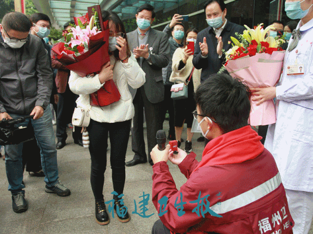 欢迎仪式将要结束时,广场上空突然响起浪漫的音乐《可不可以》。“请大家帮我做个见证,今天对我来说是个特别的日子,我在此向女朋友江燕婷求婚,嫁给我好吗?”队员林杰边说边单腿下跪。被求婚的姑娘猝不及防,满脸惊喜,笑中含泪地伸出手接受求婚戒指。现场一片欢呼。