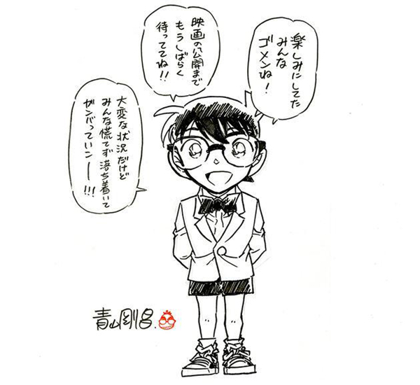 柯南的作者青山刚昌也绘图向大家表示抱歉:大家别慌,再等等。