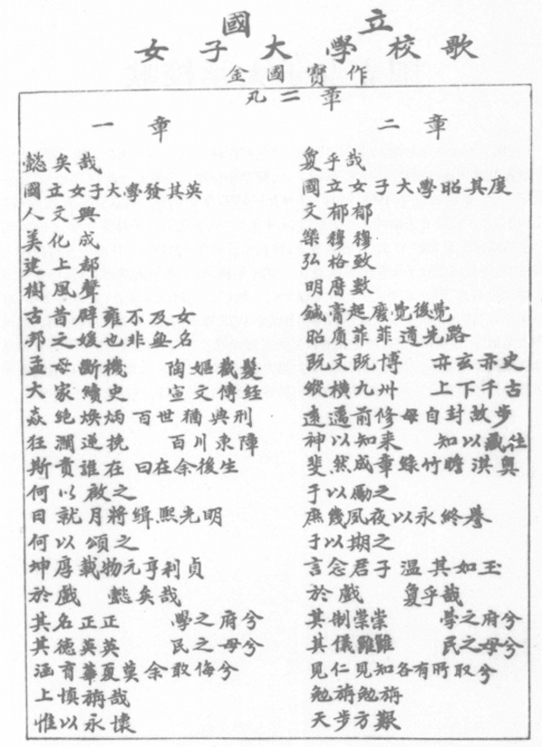 1920年,音乐家萧友梅创办北京女子高等师范学校音乐科,1925年改组为北平女子大学音乐系,聘请金国宝给音乐学生讲授诗词写作。萧友梅,广东香山人,1900-1901年在广州时敏学堂就读,当时可能已经耳闻金国宝大名。北京女高师于1925年10月更名为国立女子大学,校歌由萧友梅作曲、金国宝作词。这是金国宝一生最有纪念意义的作品,谨录歌词如次: