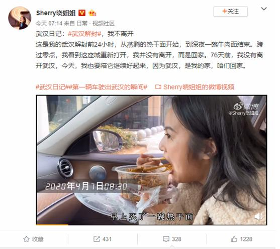 网友@Sherry晓姐姐在微博记录了武汉解封前普通的一天,从蒸腾的热干面开始,到深夜一碗牛肉面结束。跨过零点,亲眼看到家乡武汉重启恢复生机。这条视频记录的是很平凡的生活很普通的一天,但是疫情以来,武汉经历了太多,所以这才更加显得弥足珍贵。她说:“我看到这座城重新打开,我并没有离开,而是回家。76天前,我没有离开武汉,今天,我也要陪它继续好起来,因为武汉,是我的家,咱们回家。”