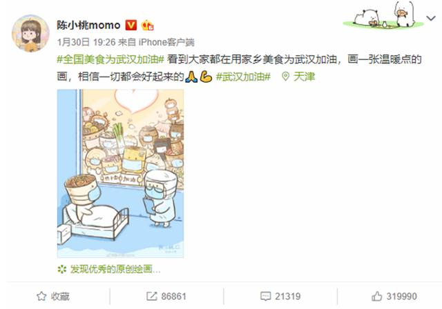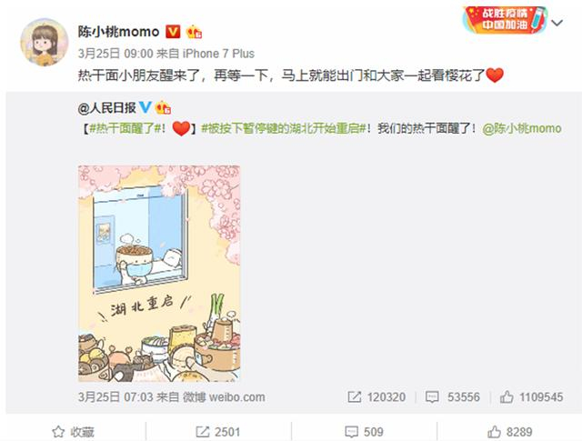 微博插画博主@陈小桃momo用画笔记录了“武汉解封”这一历史性时刻:画中,经历了76个日夜,热干面小朋友终于出院了。微博网友称,热干面冒的热气,也都是爱你的形状。纷纷为其画作点赞留言,为出院的热干面送上自己的祝福,截至目前这条微博的点赞数即将突破10万。