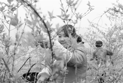近年来,河南省三门峡市卢氏县因地制宜,通过专业种植、间作套种的方式大力发展连翘种植业,目前人工种植连翘60万亩,带动贫困户参与种植,拓宽农民的增收致富渠道。图为在卢氏县范里镇柏坡村连翘种植基地,当地村民采摘连翘叶。新华社记者 郝源摄