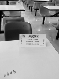 进入餐厅,洗漱间内的水龙头全部是感应洗手器,桌椅、地面、玻璃等擦洗得干干净净。每个餐桌上都有一个粉色的温馨提示卡,虽然是四人桌,但只有桌子右下角贴着“就餐位”的标识。售饭窗口前,一米线标识非常醒目。“我们准备了两套方案,一套是‘限流’方案,每个餐厅人数达到一个数字,就关闭入口。比如这个餐厅,流量测控为半小时300人,一旦超过这个数字入口将封闭。另一套方案是规定每个学院学生的就餐时间。至于选用哪一套方案,还需要开学之后检验才能最终决定,目前采取‘限流’方案。”