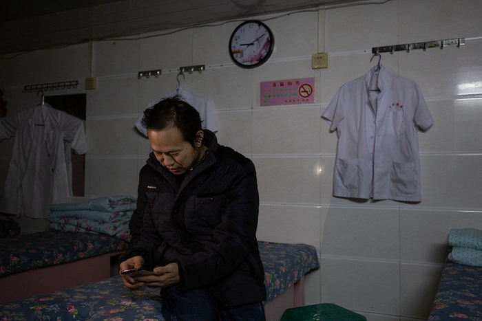 这是一家位于武汉市江汉路的盲人按摩店,48岁的谭昌锐是这里的按摩师,未能在武汉“封城”当天出城的他,无奈回到江汉路的巷口,接下来的两个多月,他只能与手机为伴。