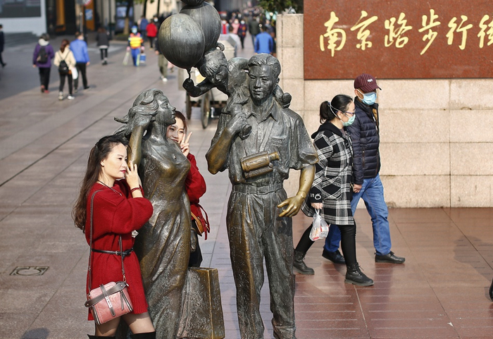 2020年4月1日,上海,南京东路步行街,疫情期间拍照的游客。