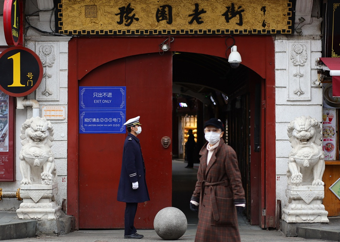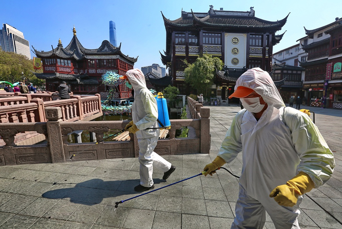 2020年3月18日,上海城隍庙,疫情期间的消毒作业。