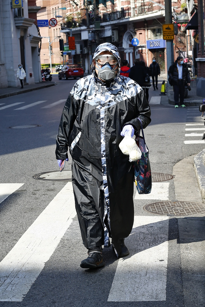 2020年3月18日,上海外滩滇池路,疫情期间全副武装的路人 。