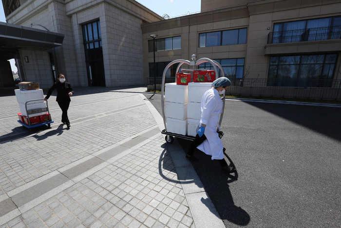 2020年3月14日,上海浦东新区,某国际航班旅客专用隔离酒店,宾馆服务员穿戴防护服上岗为隔离人员送午餐 。