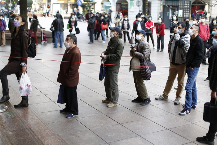 2020年4月3日,上海,南京东路新雅粤菜馆门口,疫情期间排队的人们。