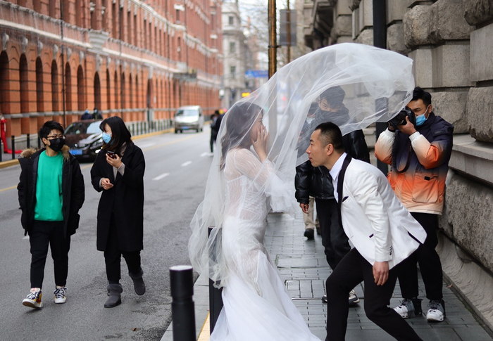 2020年3月10日,上海外滩,游人和拍婚纱照的情侣。