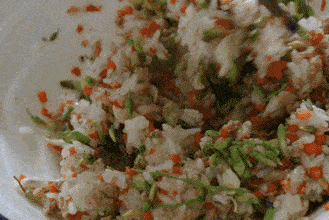 人家问,你喜欢吃甜的咸的?她说甜的,然后就看着人家把槐花饭、炒芝麻、槐花蜜给她拌了一碗。
