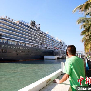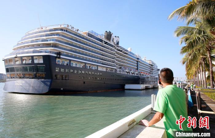 三亚市凤凰岛国际邮轮港,在人们的注视下一艘邮轮正在靠泊。(资料图) 记者王晓斌 摄