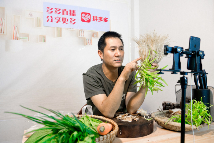 4月2日晚8时,胡德芳跟往常一样,通过拼多多开始直播做菜。一道是他刚从一家小店发现的花椒鸡,又辣又香,味道十分给力,边吃边吮着手指,12000多人在线观看的粉丝差点流出了口水。胡德芳还要展示一道地方特色菜,他把上午从100公里外乡村集市上买的丕菜根拿到镜头前,问这菜叫什么名字。这道在滇东南才有的野菜,着实难倒了粉丝们,没有一个猜对的。得意的胡德芳接下来把丕菜根切成段,和着“小米辣”爆炒。云南众多的民族文化和秀美的山川,蕴藏着他取之不尽的食材和话题。