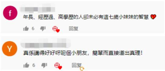不少网友视频下留言为吴若彤点赞,他们说这个七岁的小女孩真聪慧,语言能力和逻辑能力比许多大人、政客、“黄丝”强。↓