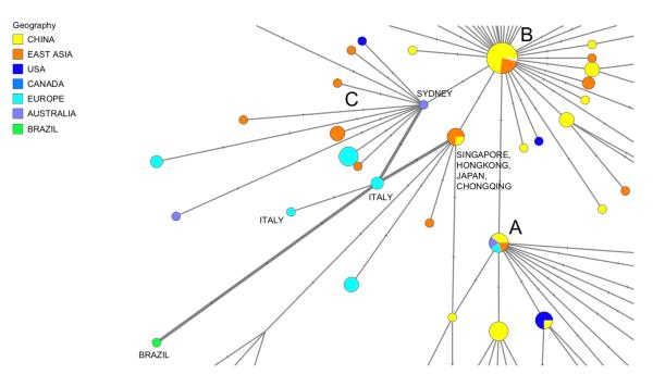 巴西患者的病毒位于系统发育网络C簇中。这名巴西患者在确诊前曾去过意大利,该网络显示意大利人和巴西人的病毒基因组之间存在突变联系。