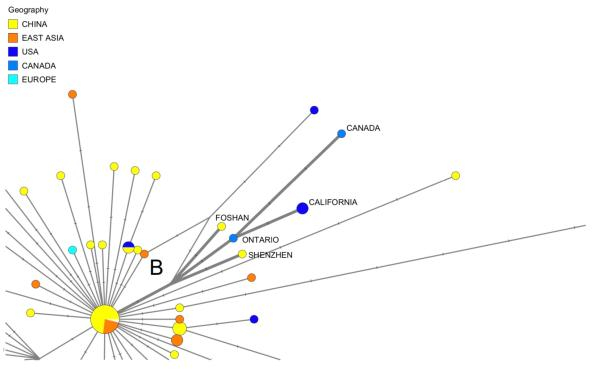 安大略省患者的病毒位于系统发育网络B簇中。该患者从中国中部的武汉旅行到中国南部的广东,然后返回加拿大,在那里他病倒,并于1月27日被确诊为COVID-19。他的病毒基因组来自一个重建的始祖节点,除了安大略省患者外,该重建的始祖节点在佛山和深圳(都在广东省)都有衍生的病毒变体,这与他的旅行历史相符。他的病毒基因组现在与其他受感染的北美人(一个加拿大人和两个加利福尼亚人)的基因组共存。