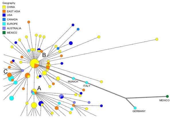 该墨西哥患者的病毒位于系统发生网络B簇中。该墨西哥患者在确诊前曾到访意大利,该网络显示意大利人和墨西哥人的病毒基因组之间有6个突变的突变距离。意大利患者病毒与慕尼黑患者病毒的区别仅在于一个突变。这名慕尼黑患者被认为是德国第一例感染病例。