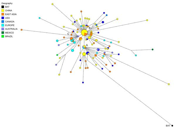 对于B型,93个B型基因组中,除了19个以外,其余均在武汉(n=22)、中国东部其他地区(n=31)和邻近亚洲国家、地区(n=21)取样。在东亚以外,在美国和加拿大的病毒基因组中发现了10个B型,墨西哥发现了1个,法国发现了4个,德国发现了2个,意大利和澳大利亚各发现了1个。