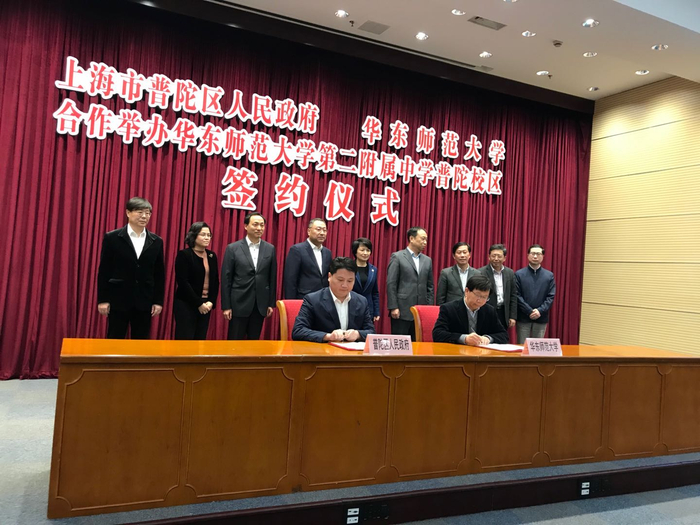 4月10日下午,普陀区和华东师范大学合作举办华东师大二附中普陀校区签约仪式举行,双方签订了合作办学协议及合作事项备忘录。此次签约标志着普陀区与华东师大新一轮战略合作框架协议的落实迈出了坚实一步,也标志着双方合作办学实现了从学前到高中教育育人体系的全覆盖。