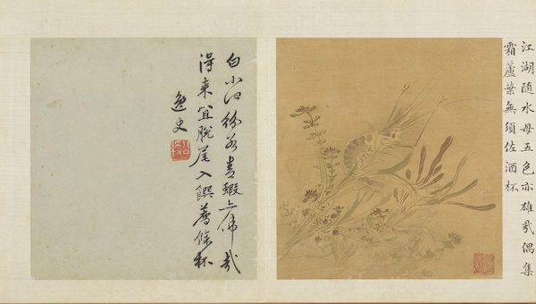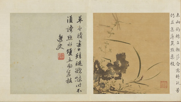 孙龙(15世纪),一名隆,字廷振,号都痴,江苏毘陵人。明宣德间(1426-1435)任职于宫廷,擅画花鸟草虫。本册共十二开,纯以墨彩点染。画绢上矾,笔虽湿而色不晕开,将干未干时层加墨笔,充分发挥墨、色融合的特殊效果。裱绫及对幅题记,分别为清仁宗、姚绶所书。展出“荇藻鱼虾”、“草石蜻蜓”、“草虫”、“柳塘白鹭”四开。