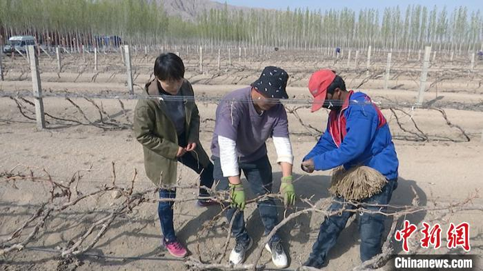 中新网乌鲁木齐4月10日电(刘雨珊 苟发军 马国庆) 连日来,新疆巴州焉耆县的10万亩酿酒葡萄出土完成,正在上架,霍拉山脚下的茫茫戈壁滩,也因为葡萄长廊,焕发出勃勃生机,更成为贫困户的“淘金地”。