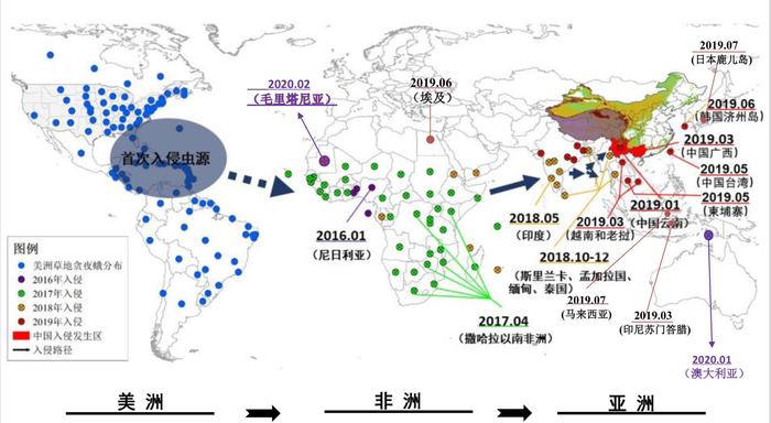 吴孔明在报告会上对《草地贪夜蛾防控手册》解读时表示,草地贪夜蛾原生地是在美洲,2016年1月份从美国的南部地区侵入到非洲的西部,然后迅速发展蔓延。“2018年12月份从云南普洱地区进入中国,随后蔓延,最近一段时间已经扩散到澳大利亚,可以说已经成为一个世界性的重大害虫。”