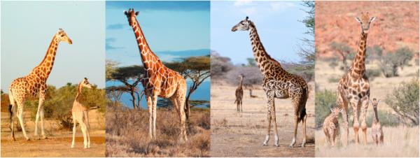 外表差别并不大的四种长颈鹿。从左至右依次是北方长颈鹿(northern giraffe,Giraffa camelopardalis), 网纹长颈鹿(reticulated giraffe,G. reticulata),马赛长颈鹿(Masai giraffe,G. tippelskirchi)和南方长颈鹿(southern giraffe,G. giraffa)(图片来源 :马赛长颈鹿:B. Dodson;余下三种来源:J. Fennessy,长颈鹿保护基金会)