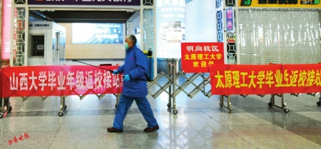 4月10日,太原理工大学首批2100余名毕业生返校。太原理工大学在太原火车站、太原南站和太原武宿国际机场设立了专门接站点,为乘坐公共交通工具返校的学生提供接站服务。