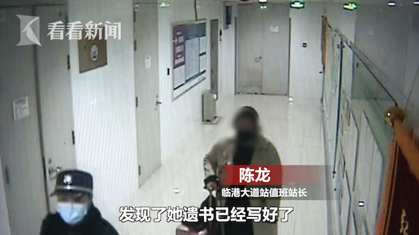 临港大道站值班站长陈龙说:“我们这边打开行李箱的时候,发现了她遗书已经写好了。我们给她倒了杯热水,开始安抚她,然后我就给乘客去买了一个便饭,还有牛奶跟巧克力,因为她说那个前一天晚上是在公园睡了一夜,然后肯定也没有吃饭。”