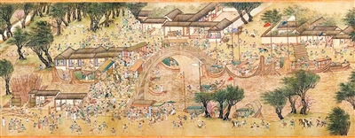 “清院本”《清明上河图》是仿照各朝版本、集各家所长之作品。明清时代的清明风尚,如踏青、表演、猴戏、特技、擂台等娱乐活动也为此图增加了许多情节。画中事物繁多,虽失去了宋代古制,却是研究明清之际社会风俗不可或缺的资料。 (秦延安 宗合)