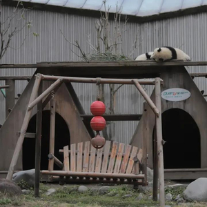 该馆旁边的熊猫幼儿园2号馆正在装修,原本住在那里的1岁左右的熊猫幼仔,被转移到了外环区域的外环2号馆。记者看到,除了幼仔群居馆舍的室外运动场有丰容吊球,其他成年大熊猫单独居住的运动场,除了类似吊床以及一个吊在两棵树之间的滚筒,并未看到类似的丰容吊球,大部分只有假山和木架。