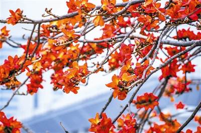 木棉又名英雄树、攀枝花,是一种美丽的观赏树木,春季先花后叶,花大色红,嫣红花朵染红半边天际