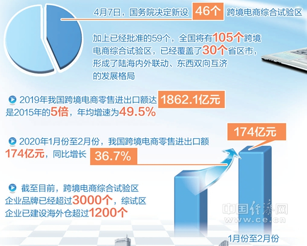疫情发展并未影响我国跨境电商综合试验区再次扩围。4月7日,国务院决定新设46个跨境电商综合试验区,加上已经批准的59个,全国将拥有105个跨境电商综合试验区,已经覆盖了30个省区市,形成了陆海内外联动、东西双向互济的发展格局。