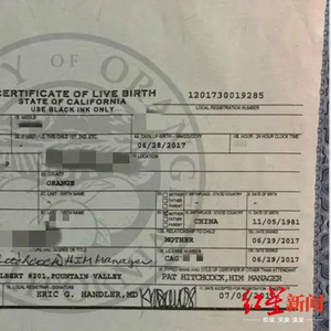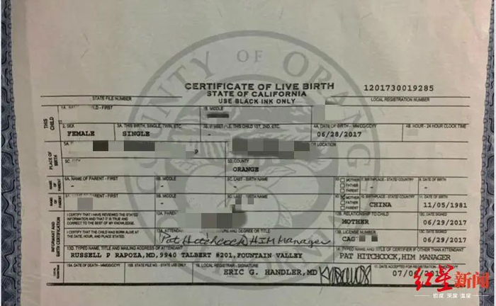 吴某告诉红星新闻,她与余某2016年赴美国洛杉矶登记结婚并接受胚胎移植,当时两人都有取卵培育,吴某的卵子胚胎培育没有成功,“我们都怀上了宝宝,两个宝宝的受精卵都是余某提供的。”2017年,两人在美国分别分娩一子一女(孩子均系美国国籍),美国医院出具的出生证明显示,余某是5月出生的男孩的母亲,吴某是6月出生的女孩的母亲。