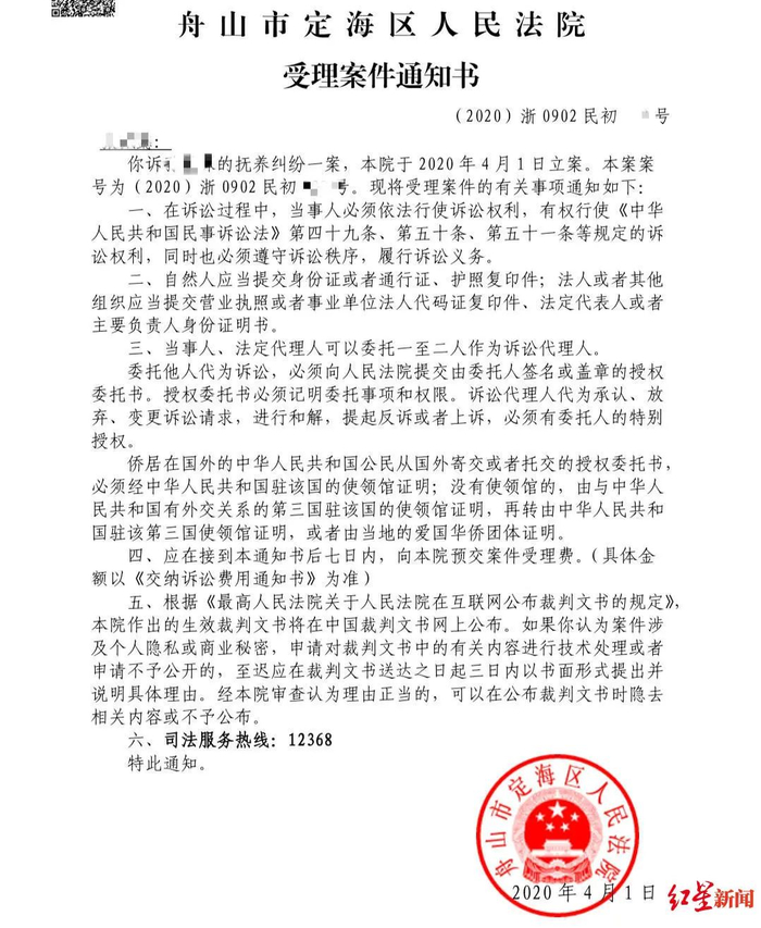 根据吴某提供的一份舟山市定海区人民法院受理案件通知书显示,吴某诉余某抚养纠纷一案,该法院已于4月1日立案受理。红星新闻从该法院处获悉,案件目前正在审理之中。