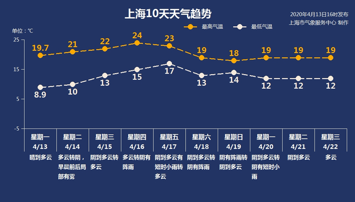 据上海气象部门预计,4月14日早晨,上海位于高压中心附近,风力小,易形成辐射雾,尤其是部分郊区早晨会出现能见度短时下降的情况。同时,由于辐射降温的原因,早晨凉意依然明显,城郊差异也比较大,中心城区10℃,郊区仅6-8℃之间。白天风力不大,气温继续回升,最高气温在21℃左右。