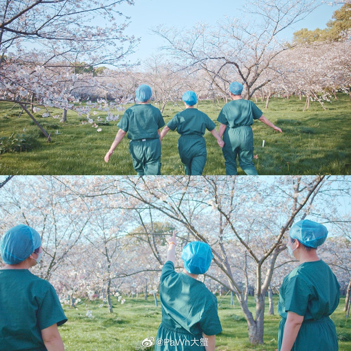 缓慢移动的镜头里,武汉春光明媚,樱花开满街头,四下却依然冷清。随着音乐逐渐推至高潮,镜头里忽然出现戴着口罩的医护人员,人们纷纷走到户外,迎向花海。一行“武汉回来了”的字幕浮现,触动人心。