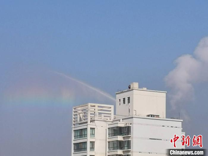图为兰州市西固区利用高科技的“唤雨”设备向空中实施360度旋转喷洒作业,水雾在阳光照射下形成了人造“彩虹”。(资料图) 史静静 摄