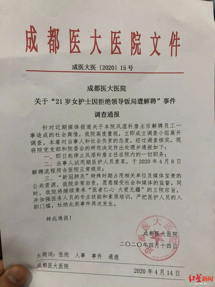 4月14日,在事件曝光一天之后,成都医大医院方面就“21岁女护士拒绝领导饭局,并遭解聘事件”,发布了调查通报。