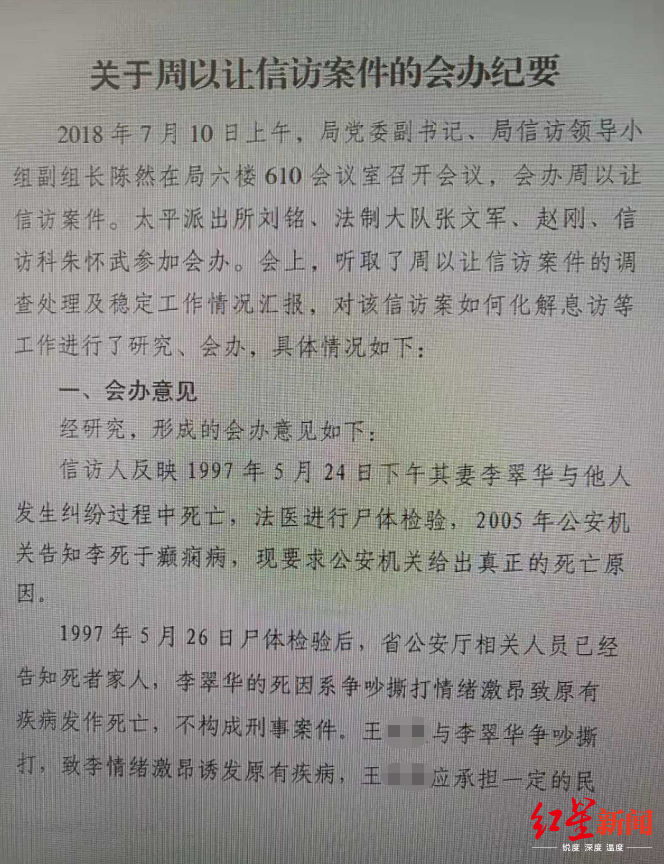 而2018年泗洪县公安局一份关于周以让信访案件的会办纪要显示,1997年5月26日尸检后,省公安厅相关人员已经告知死者家人,李翠华死因系争吵厮打情绪激昂致原有疾病发作死亡,不构成刑案。同时,王某对李翠华之死应承担一定的民事责任,周以让应向人民法院提起民事诉讼。会办结论为认定周以让信访案件结案。
