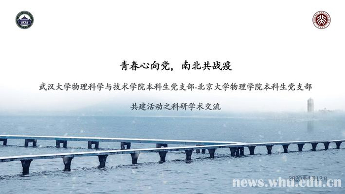 新闻网讯(通讯员卢丽珠)凛冬已逝,春暖花开。未名珞珈,共话研学。4月12日晚6:30,武汉大学物理科学与技术学院本科生党支部与北京大学物理学院本科生党支部开展了“青春心向党 南北共战疫”第二次共建活动之科研学术交流。